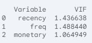 Based on the Variance Inflation Factor (VIF) calculation, the columns recency, frequency, and monetary are statistically independent of each other and not informationally overlapping.